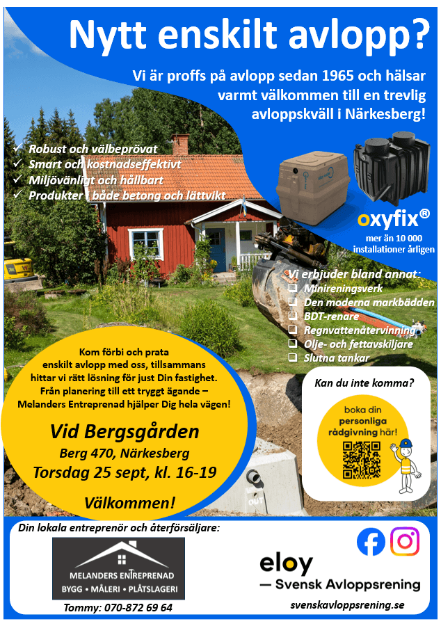 Kan du inte komma men är intresserad av mera info eller ett hembesök, kontakta Melanders Entreprenad på telefon nedan eller Eloy – Svensk Avloppsrenings områdesansvariga Jonas Vennberg på 073-520 35 23.