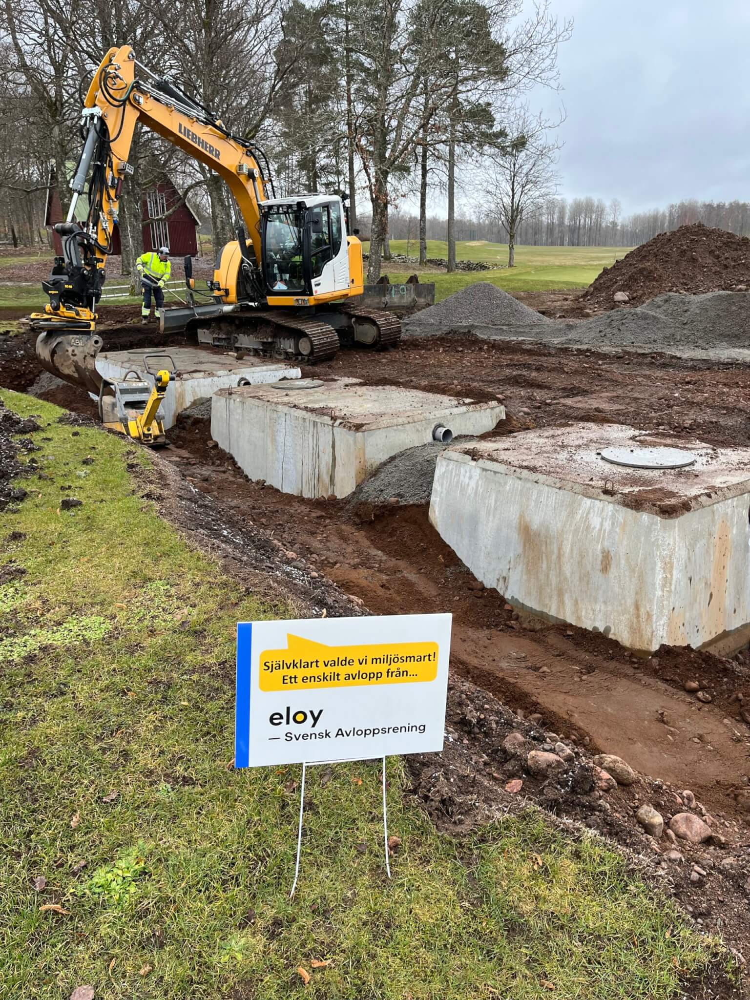 Bilderna visar en leverans denna vecka av en Oxyfix 80PE. Det är Åsundsholm Golf & Country Club utanför Ulricehamn som skaffar nytt kvalitetsavlopp inför säsongen, leveransen innehöll även en ny och rejäl fettavskiljare för restaurangen. Som alltid en kompakt och robust helhetslösning. Installerar gör Tranemo Trädgårdstjänst.